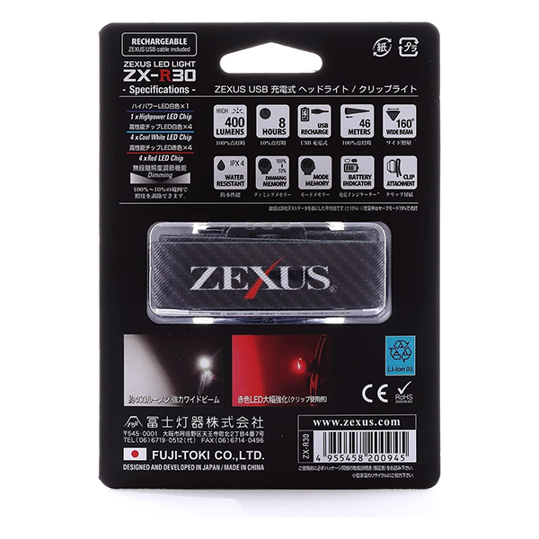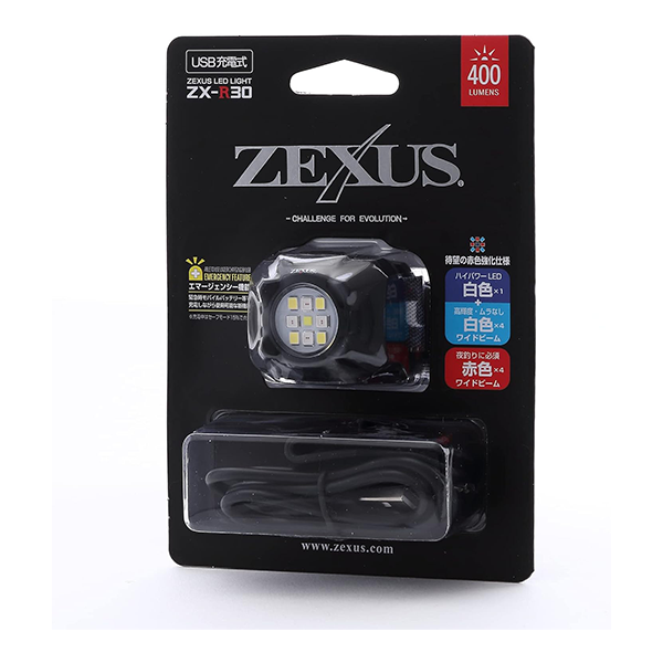 ZX-R30 headlamp by ZEXUS, Japan. A headlamp with a particularly light and compact design with a high power of 400 lumens, ideal for fishing, camping, or any nighttime use.